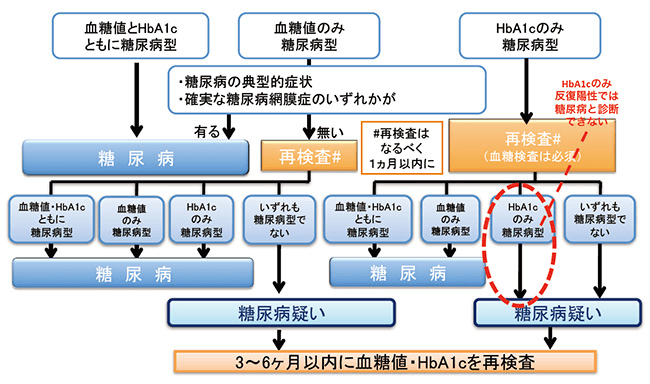 「糖尿病型」が同日、または別の日に2つ確認されると糖尿病の診断となります。(図1)